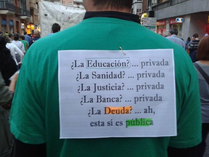 Tras el estallido de la burbuja, en un intento de salvar la economía mundial de la quiebra, los gobiernos correspondientes se han dedicado a “rescatar” sociedades privadas con dinero público, dejando a la intemperie a los ciudadanos que hemos tenido que cargar con la culpa y con las medidas de austeridad, como si nuestro deseo (derecho) de una casa digna fuese el causante de toda esta deriva. A la vez, bajo la justificación de un supuesto exceso de gasto público, se está procediendo a desmantelar el Estado del bienestar, mediante una serie de recortes en los servicios que son esenciales para la vida, con la paradoja de que esos ajustes se hacen para pagar a las entidades financieras.