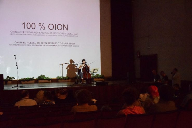 En el enlace que me adjuntaba me pude conectar con el resultado: un excepcional, por su “extrañeza”, conjunto de piezas sonoras, poéticas y políticas pensadas por y para el pueblo de Oión (en Álava). Esta pequeña población es un lugar muy peculiar que está a 3 km de Logroño, pero por cuestiones de anacrónicas limitaciones, administrativamente pertenece a Euskadi. Tiene 3.000 habitantes de 23 nacionalidades de origen diferente, 25 % paro y muchísimos problemas de convivencia, derivados casi todos de la falta de trabajo. Dicen que los emigrantes van a quitarles el trabajo, que hay un efecto llamada, dicen que no quieren trabajar, que son machistas y bajan el nivel escolar, que colapsan los hospitales y que vienen a cobrar las ayudas especiales. Como me explica Idoia, este conjunto de piezas sonoras (que enlazan con la tradición, a la vez que con la experimentación sonora, que se enorgullece de las imperfecciones técnicas de las voces aficionadas, a la vez que persigue la calidad profesional, que de manera natural utiliza el castellano y el euskara y que se proclama “popular” sin ninguna vergüenza y sin embargo tiene una admirable «distinción» por su osadía desacomplejada) es resultado de un proyecto en el que ha estado trabajando mucha gente los dos últimos años con el objetivo de mejorar la convivencia, contra los estereotipos y los prejuicios racistas. Un complejo mecanismo creativo para generar procesos de participación inclusiva e intergeneracional, lúdico y humorístico, pero también dramático y realista. En la grabación han participado unas 100 personas del pueblo: la gazte asamblada (asamblea de jóvenes) mujeres árabes con sus niñas, Asima y sus tres hijos, los bertsolaris del pueblo, Eh Mertxe, la banda de rock del pueblo, los auroros y auroras, el coro (un coro de quejas), Manolo, Basilio, el apoyo de la familia de Bidehuts: K. Osinaga, Aida Torres, Mariano Hurtado, personas y más personas, todo con la inestimable colaboración de Maite Arroitajauregi – Mursego- una de esa artistas que se han construido así mismas con las mimbres de potencias poéticas y musicales inclasificables, notable excepción artística en un panorama donde la uniformidad impide distinguir la diferencia, capaz también de coordinar esta “anomalía” artística tan sorprendente.
