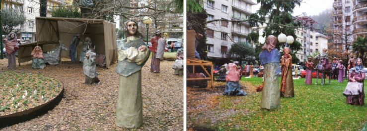 Mucho más en concreto, en mi pueblo, Tolosa, hemos vuelto a escuchar las reiteradas quejas contra el belén municipal instalado en la Plaza del Árbol de Guernika, realizado a finales de los años ochenta por los profesores de aquel primer taller de artes de la Casa de Cultura, formado por Amaia Biurrun, Iñaki Epelde (que en paz descansen) José Luis Longarón y Arantxa Munita (nunca he sabido si ese desprecio popular es por que el belén está viejo y degrado y mal iluminado, descuidado y nada renovado –me consta que Epelde se empeñó muchas veces en mejorarlo- o porque es “feo” y “raro”, aunque sospecho que lo primero oculta lo segundo). En aquellos años de renovación democrática y de cierta apertura a la aventura formal aquellos artistas trataron de compaginar cierta modernidad de inspiración oteiziana con el tradicional gusto popular. En un complicado equilibrio, nunca resuelto del todo, intentaron conjugar cierta osadía artística con el beneplácito de los que pudieran sentirse provocados por aquellas nuevas imágenes, poco fieles a las convenciones belenísticas al uso, fundamentalmente heredadas de la tradición barroca napolitana e implantadas en España por Carlos VII en el siglo XVIII, primero en la aristocracia y más adelante adoptadas por el imaginario popular.