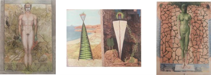 Tanto es así, que Ameztoy insiste en poblar sus paisajes con arquitecturas industriales, artefactos y objetos de la vida cotidiana, pero, sobre todo, con  cuerpos extraños, indeterminados en su condición sexual, andróginos, transfigurados; seres que le acompañaron en sus vivencias, algunos reconocibles, otros no tanto y muchos inventados por su imaginación desbordante; en cierto modo, adelantándose al tiempo, se podría hablar de personajes queer (raros), desnormativizados, pobladores de paisajes que muy bien podrían formar parte de una película de ciencia ficción, género cinematográfico que tanto influyó en su obra. Es decir,  siempre que nos muestra la naturaleza, fascinado por su presencia y absolutamente respetuoso con su conservación, lo hace como un escenario de ficciones, un teatro de la vida o, mucho mejor, un plató atravesado por formas culturales y figuraciones trans y poshumanistas.