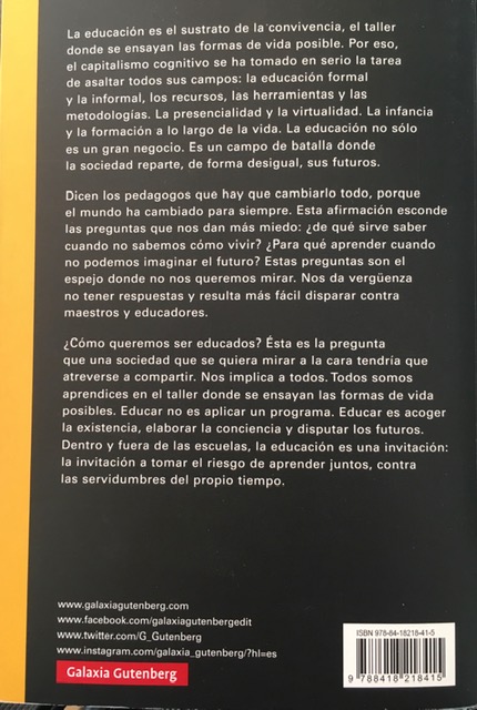 Ahora que vivimos bajo el horizonte de un posible colapso,¿cómo podemos imaginar, entonces, una amplia socialización entre iguales que realmente pueda ser la promesa en camino de una sociedad más justa, donde la educación sea buena para todos? Garcés nos vuelve a preguntar: ¿Es la escuela la que se tiene que hacer cargode esta promesa, cuando la geografía de nuestros barrios y pueblos, dibujada por la especulación inmobiliaria, va en su contra, cuando la invasión íntima de las plataformas audiovisuales y las redes sociales conforman, segundo asegundo, los cerebros de los más jóvenes y de los no tan jóvenes, cuando las reformas laborales, las regulaciones de los alquileres y las medidas sociales coinciden en proponer un escenario cada vez más precario y violento? La alianza de aprendices pone la igualdad en el centro, conseguirla es un proyecto complejo que solo puede ser desarrollado a partir de compromisos y de obligaciones compartidas, negociadas y batalladas que se hagan cargo de las situaciones del presente. Siempre es el resultado de algún tipo de intervención política, dice Garcés, porque necesariamente cambia las relaciones de poder existentes; y poética, porque altera los códigos de valor establecidos