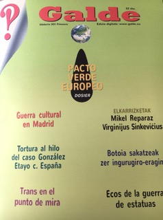 Por otro lado, por mediación de Manu González Baragaña, del Observatorio de Sostenibilidad de la Fundación Cristina Enea, Donostia y miembro del consejo editorial de la revista GALDE, me ha brindado la oportunidad de publicar Vivir en tránsito un texto que publiqué en mi blog el pasado mes de marzo. Forma parte de un pequeño dossier titulado «Trans en el punto de mira» sobre la cuestión transfeminista con textos escritos por Josebe Iturrioz, Anaitze Agirre, Silvana Luciani y Tamara Martínez. El artículo lo escribí como reconocimiento a todo lo que a lo largo de mi vida he aprendido, como hombre heterosexual, de los movimientos de liberación homosexual, lesbianas y trans y, también -lo reconozco- desde la decepción que me han causado las últimas críticas transfóbicas lanzadas desde ciertos sectores del feminismo. Esta revista enraizada en la realidad particular de Euskadi pero abierta al mundo y a todo tipo de problemas e inquietudes. GALDE es una revista en papel, complementada por una edición digital cuyo enlace os he añadido al comienzo de esta nota.