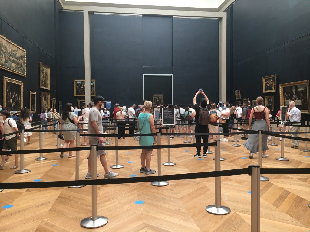 La última vez que estuve en el Museo del Louvre de París, me quedé sorprendido de la parafernalia que la institución había organizado para contemplar La Gioconda de Leonardo da Vinci: un dispositivo de circulación muy parecido a los que se organizan en los aeropuertos para pasar por los aparatos de seguridad. Además, el cuadro está protegido por una urna de cristal que se sustenta en una especie de altar -nunca mejor dicho-, circunvalado por una barra de protección que rodea toda la estructura. Las decenas de espectadores de la cola accedían de uno en uno o de dos en dos a la altura frontal del cuadro. Nosotras, sin hacer la cola, pasamos por el lateral derecho del cuadro, y lo contemplamos desde una posición lindante. Unos minutos antes, en la sala contigua, habíamos contemplado prácticamente solas el San Juan Bautista, a su lado La virgen de la Rocas, a su derecha, La bella Ferroniere y, cerrando el conjunto La Bella, el niño Jesús y Santa Ana; todas piezas notables, también del mismo artista.